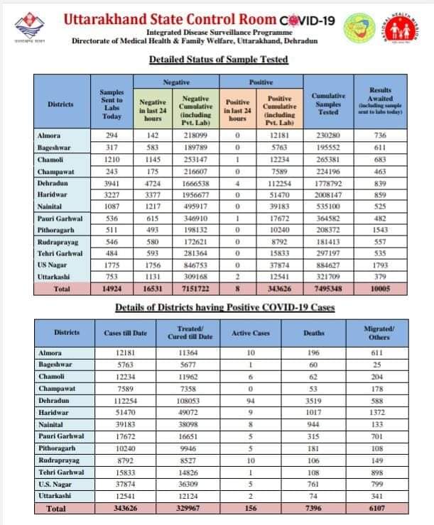 देहरादून | उत्तराखंड में 07 अक्टूबर 2021 को हेल्थ रिपोर्ट के अनुसार कोरोना मरीजो की संख्या हुई 343626 आज कुल 08 नए मामले मिले, कोरोना संक्रमण से आज प्रदेश में कोई मौत नही हुई है | आज जहाँ 14 मरीज ठीक हुए वही 08 नये मरीज मिले |