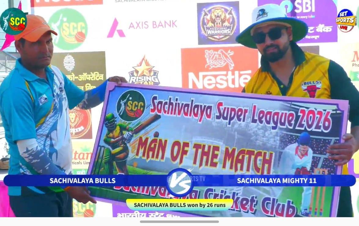 देहरादून | सचिवालय सुपर लीग 2026 अब अपने निर्णायक पड़ाव पर पहुँच गई है। महाराणा प्रताप स्पोर्ट्स कॉलेज के मैदान पर खेले गए क्वार्टर फाइनल मुकाबलों में सचिवालय पैंथर्स और सचिवालय बुल्स ने अपने-अपने मैच जीतकर सेमीफाइनल में प्रवेश कर लिया है। दिन के पहले क्वार्टर फाइनल में सचिवालय पैंथर्स और सचिवालय वारियर्स के बीच बेहद कड़ा संघर्ष देखने को मिला। पहले बल्लेबाजी करते हुए पैंथर्स की टीम 18.2 ओवरों में 117 रनों पर सिमट गई। अजीत शर्मा ने मात्र 18 गेंदों में 38 रनों की तूफानी पारी खेली, जबकि प्रमोद नेगी ने 34 रनों का महत्वपूर्ण योगदान दिया। वारियर्स के गेंदबाज नीरज भंडारी और रोहन सैनी ने शानदार प्रदर्शन करते हुए 3-3 विकेट झटके।