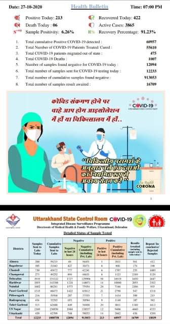 देहरादून | उत्तराखंड में 27 अक्टूबर को हेल्थ रिपोर्ट के अनुसार कोरोना मरीजो की संख्या हुई 60954 आज कुल 213 नए मामले मिले , वही 55610 मरीज हुए है ठीक जब कि इस कोरोना संक्रमण से 1007 लोगो की मौत भी हुई है | आज अधिक संख्या में देहरादून में 58, नैनिताल में 24, पौड़ी में 21, टिहरी में 29 कोरोना के नए मामले मिले है |