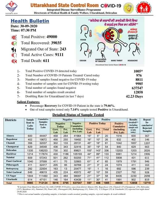 देहरादून | उत्तराखंड में 30 सितम्बर को हेल्थ रिपोर्ट के अनुसार कोरोना मरीजो की संख्या हुई 49000 आज कुल 1005 नए मामले मिले , वही 39035 मरीज हुए है ठीक जब कि इस कोरोना संक्रमण से 611लोगो की मौत भी हुई है | आज अधिक संख्या में देहरादून में 336, हरिद्वार में 133, नैनीताल में 112, पौड़ी में 65, उधमसिंहनगर में 58, चम्पावत में 54, चमोली में 61, उत्तरकाशी में 41, टिहरी में 59 , टिहरी में पिथौरागढ़ में 24 कोरोना के नए मामले मिले है |